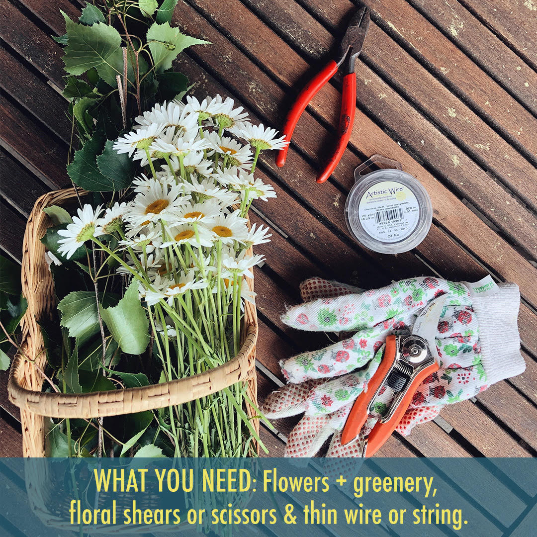 Materials: Flowers and greenery – Floral shears or scissors – Thin wire or string