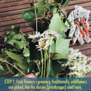 Start by finding your flowers and greenery! In Sweden, we have flowers called ”midsommarblomster” which are the wildflowers blooming all across the country during the time of midsummer. One of them is featured in our wreath, prästkragar (the common daisy). The legend has it that if a girl living on the country side picked 7 flowers on Midsummer’s Eve, each flower from a different pasture, and slept with the flowers under her pillow, she’d meet the man she’d fall in love with!