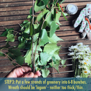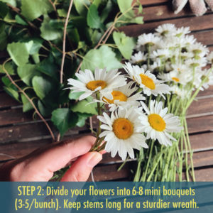 Divide your materials up! Divide the flowers into mini-bouquets, 3-5 flowers each. To create a sturdier wreath, keep the flower stems long. Make about 6-18 similar or different bouquets, depending on preference. Bunch together a few stems of greenery to make 6-8 bunches. You want a full but not too full wreath. Think the Swedish word ”lagom”; you want the fullness to be ”just right”.