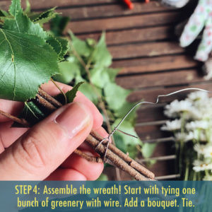 Start assembling the wreath! Take a bunch of greenery, tying them together with your wire. Add your first bouquet, also tying them to the greenery with your wire.
