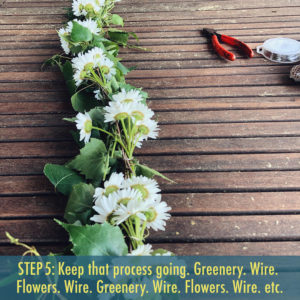 Keep it up! Keep that process going, adding more greenery, then flowers, greenery, then flowers. Alternatively, start by creating your base wreath of greenery. Then, fasten the flowers evenly spaced throughout the closed wreath.